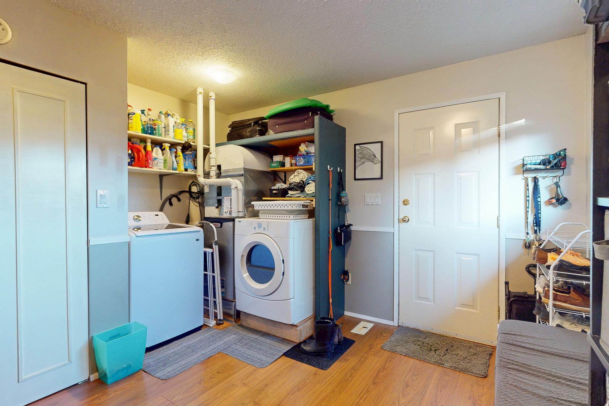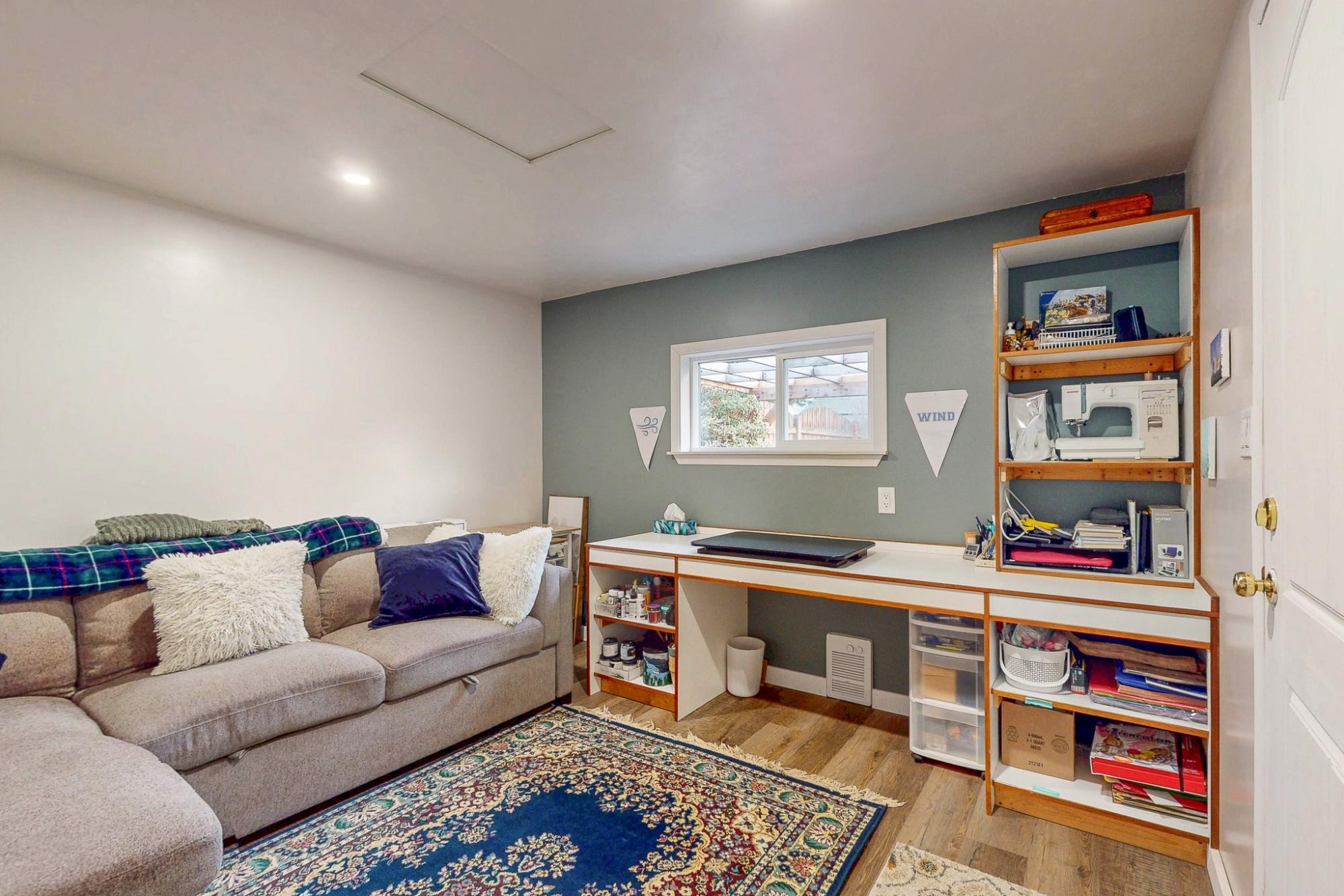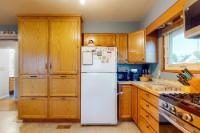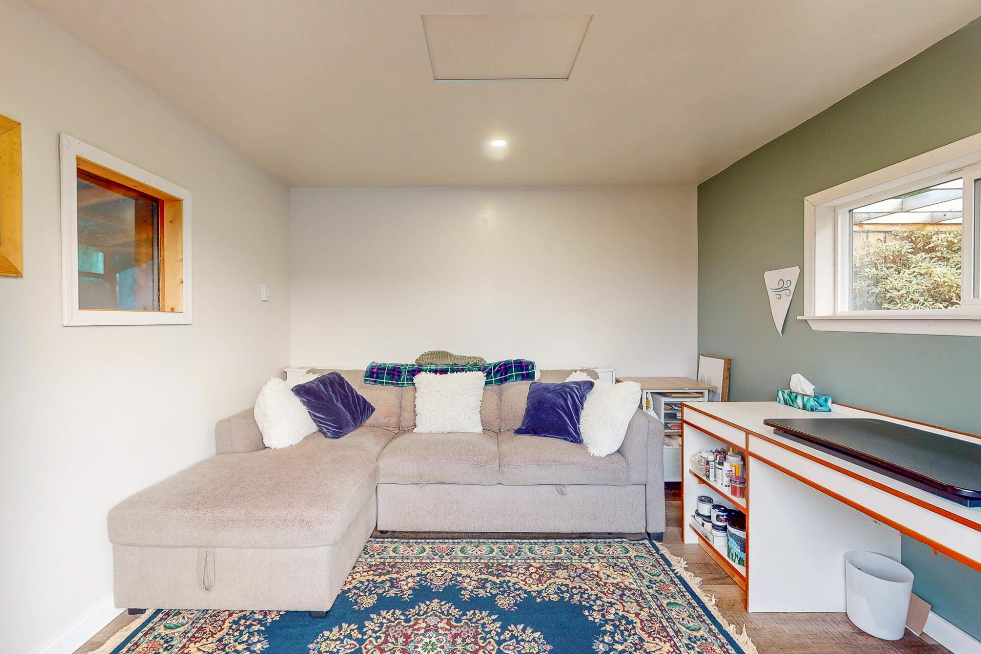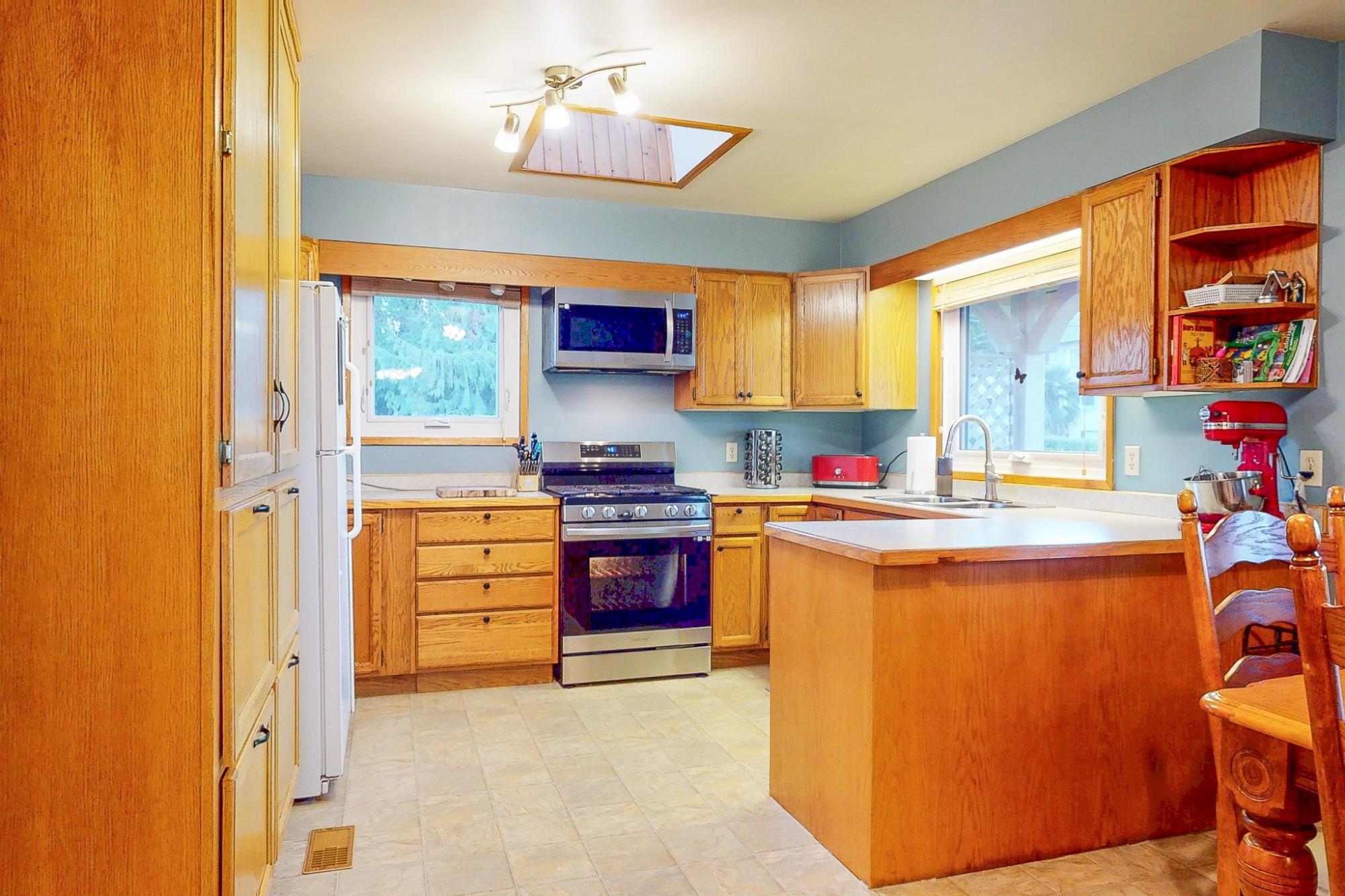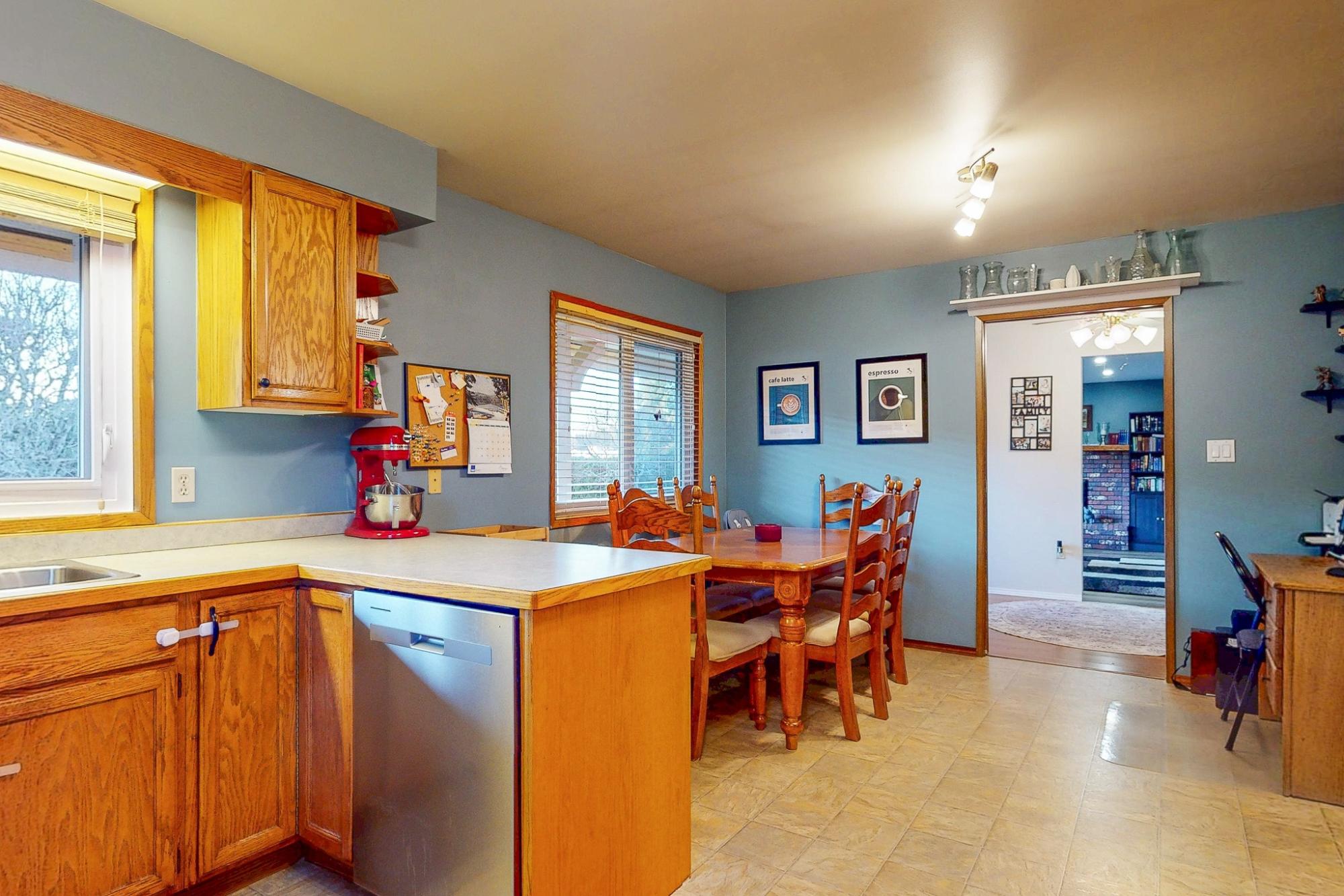 Super cute central rancher on a large corner lot. With recent updates including furnace, hot water tank, dishwasher, washer, all new windows, paint and flooring, this 2 bedroom/2 bath home has been a perfect starter home for a couple, only walking distance to shopping and appointments. A large entryway welcomes you to a spacious, cozy living room with gas fireplace on one side and a conveniently designed kitchen with room enough for two ’chefs’ and lots of storage on the other side. A fully finished heated studio outside is an ideal office space or extra bedroom. The drive-through garage with lockable storage shed/workshop flows into the fully fenced backyard which gets lots of sunlight for gardens. This one is all ready for move in! Call, text or email for a showing.