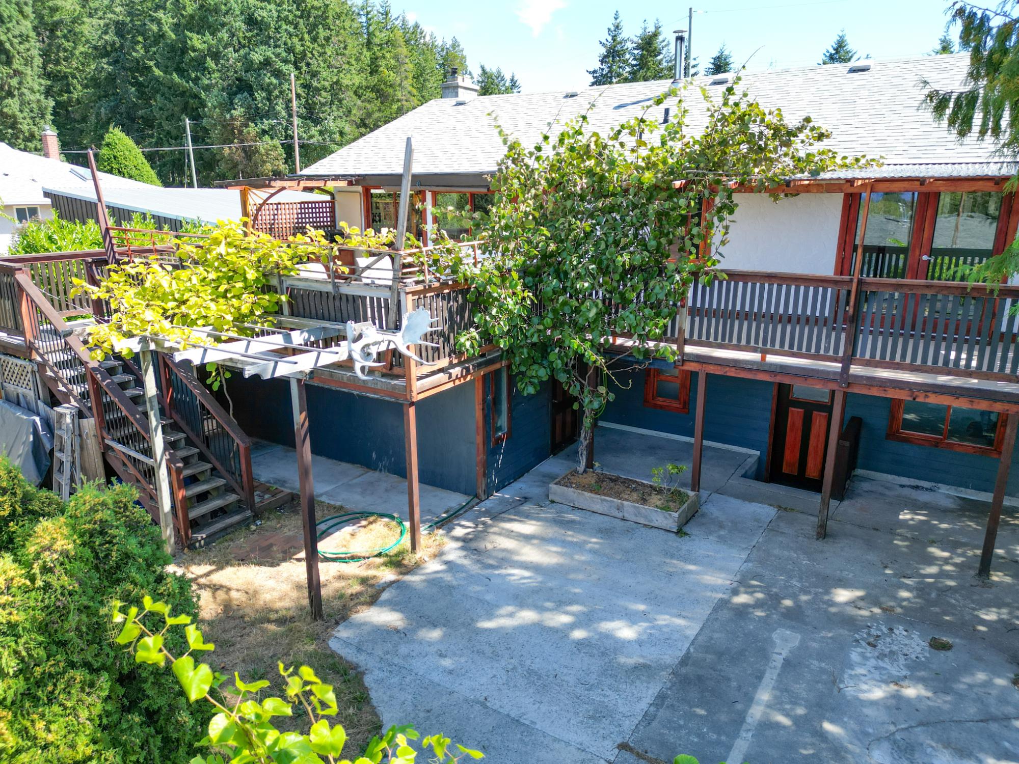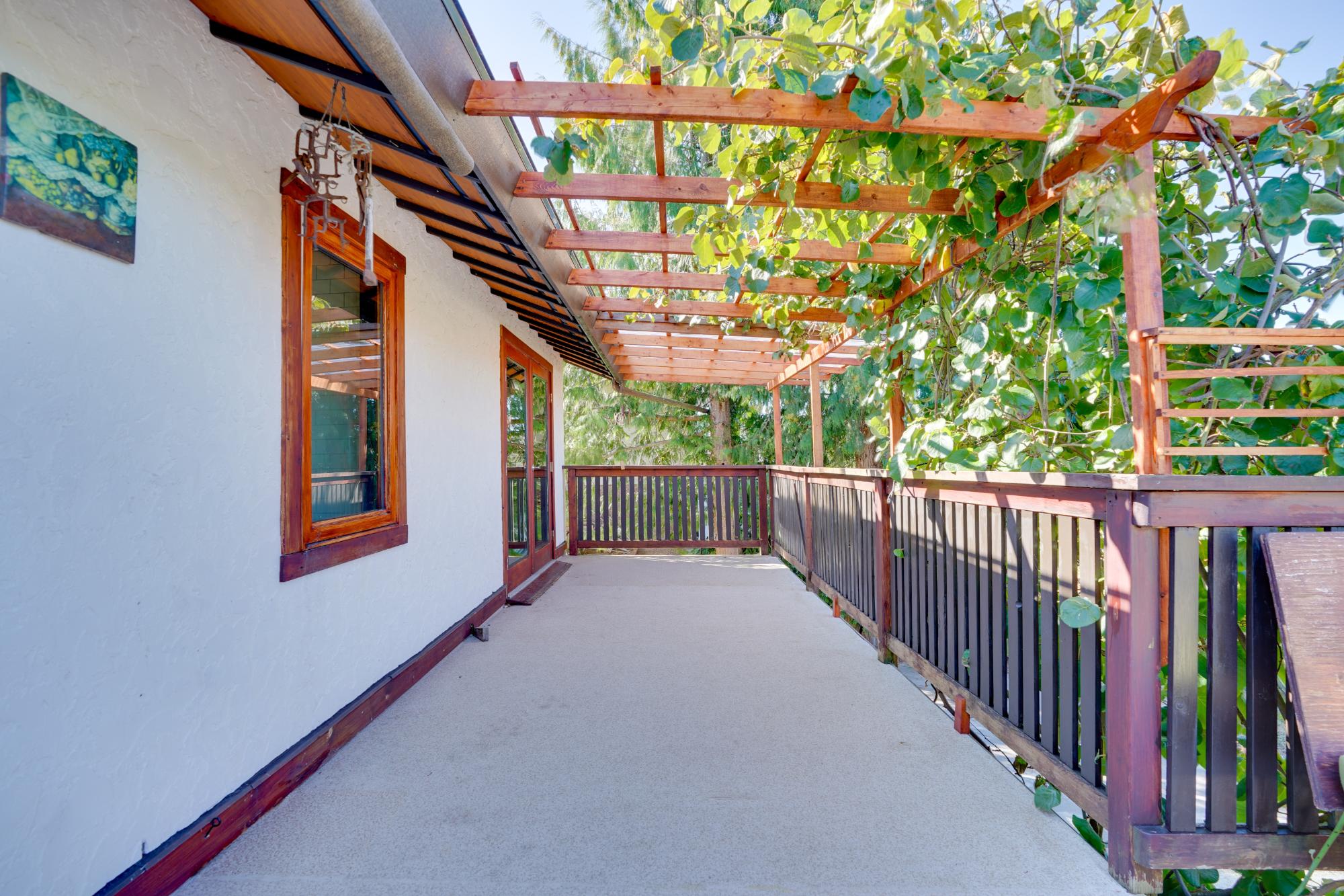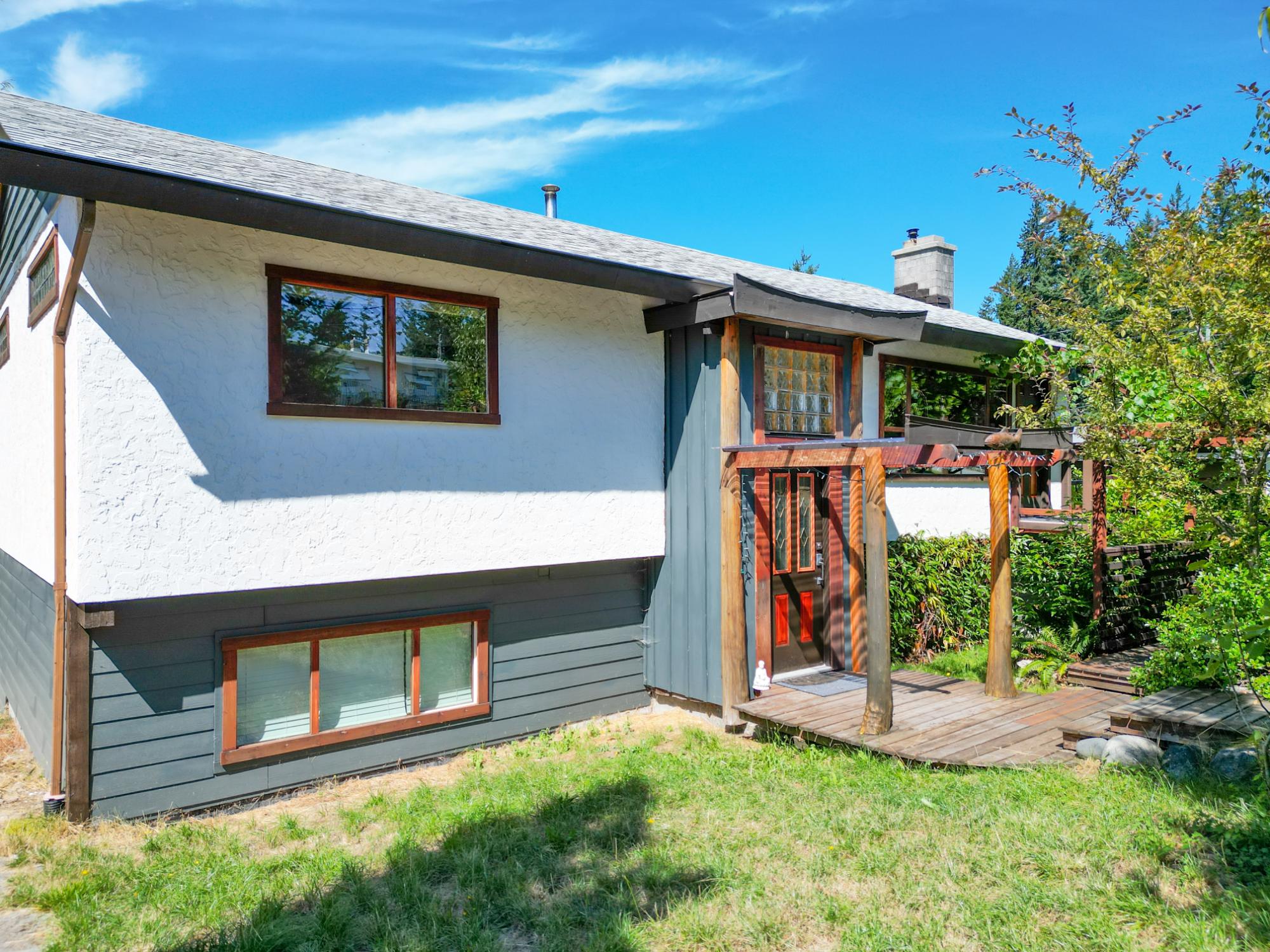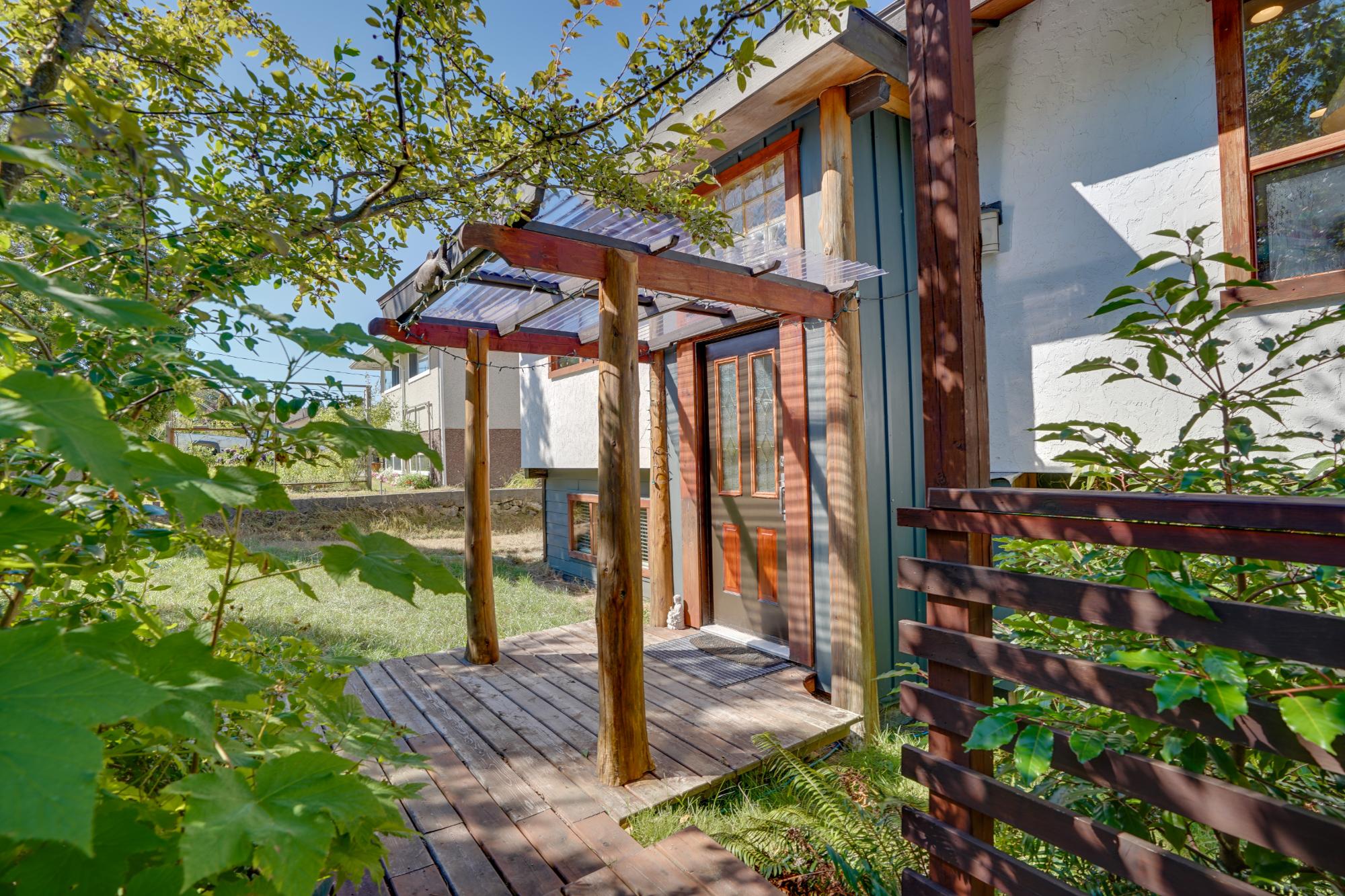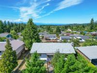 This split-level home offers ocean views, natural light, and handcrafted charm. Upstairs features 2 beds and 1 bath, with a third bedroom down plus a separate 1-bed in-law suite with its own entrance and yard. Updates include a newer roof, hot water on demand, central A/C, and added attic insulation. The granite kitchen, wood floors, and custom woodwork throughout create warmth and personality. French doors in the primary open to a large deck—perfect for sunset views. The terraced yard offers distinct spaces for home and suite living, plus boat/RV parking and a workshop. Set in peaceful Wildwood just around the corner from Sunset Park and trails, this isn’t your average home.