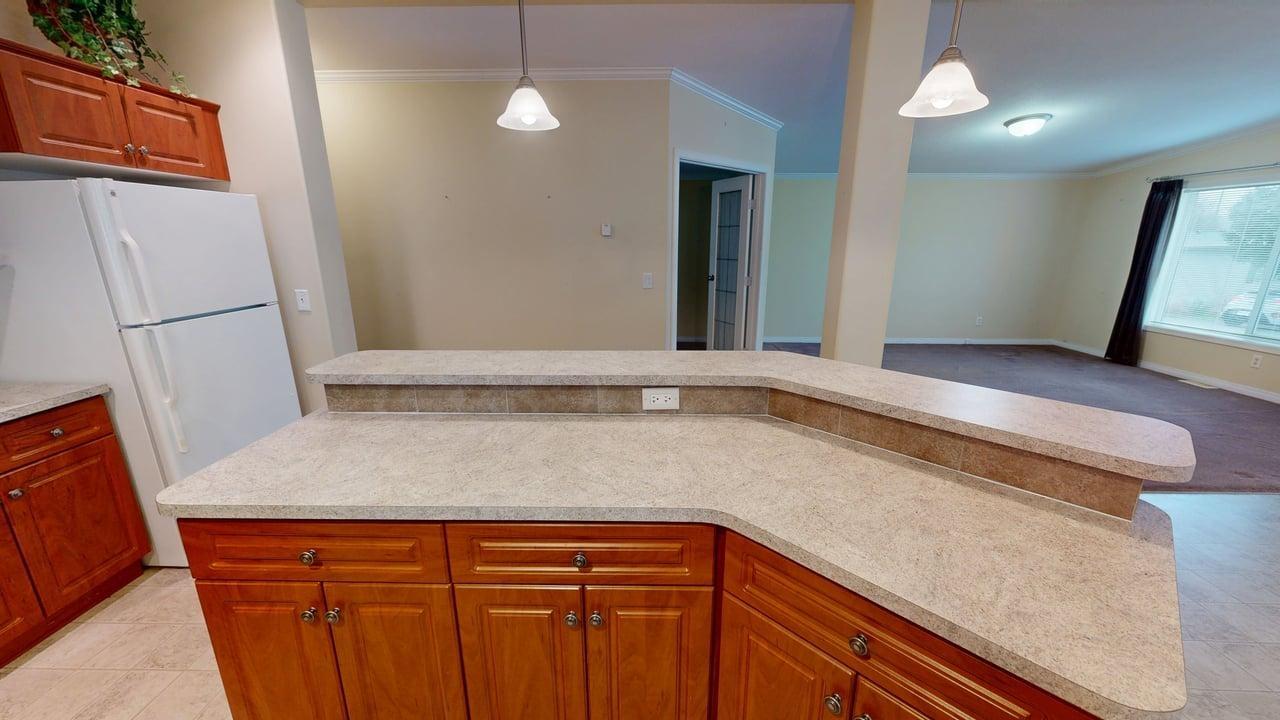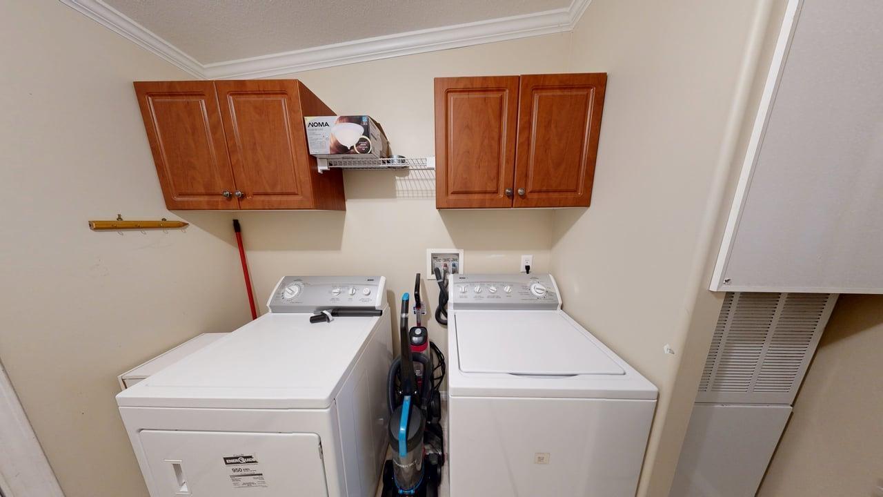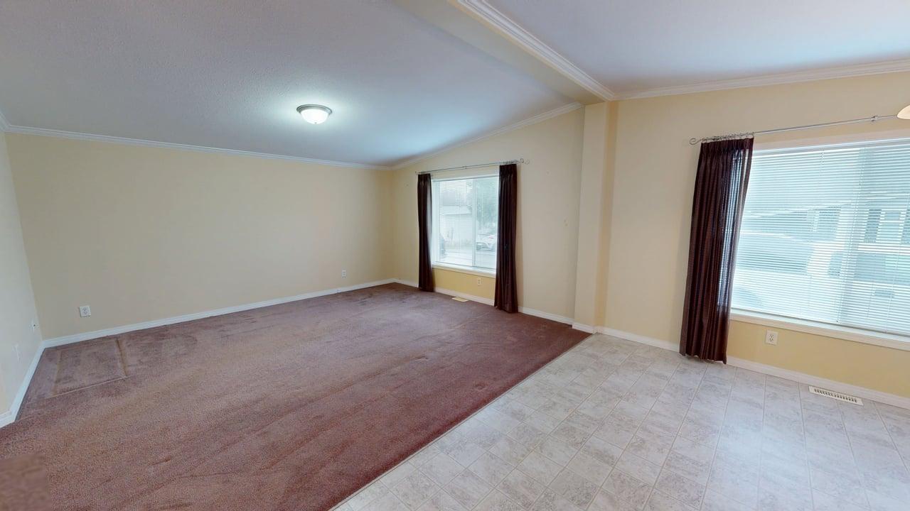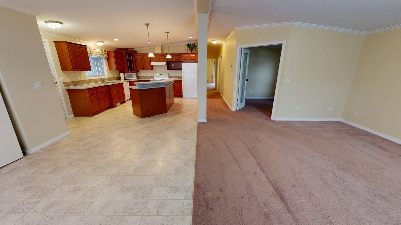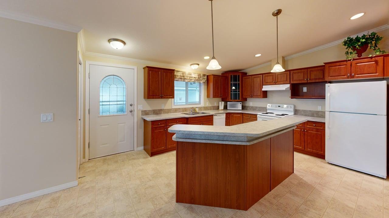 RETIRE IN STYLE – RURAL LIVING ON THE GOLF COURSE – Two bed plus den, this well maintained, 1,404 sq ft double wide manufactured home in Sherwood Park Estates is a fab way to downsize! Peaceful living in this established 55+ community (pad rent $450 per month) right beside Myrtle Point Golf Club. Spacious open-concept design, featuring raised panel auburn cabinets plus island with eating bar. Generous primary suite boasts French doors leading to private patio with views of the green space out back, walk-through closet, and large ensuite. Main bathroom is equipped with a large soaker tub. New covered side deck, electric forced air heat, plus unit is securely tied down for added peace of mind. Just a 15-minute scenic drive along the ocean to town, this home is perfect for taking life a little easier. Make your appointment today to view this special property.