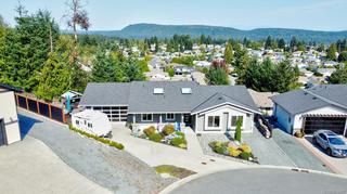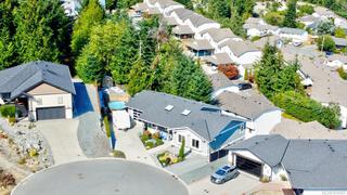 Panoramic mountain-view modern home located on a quiet cul-de-sac at the top of the hill ! This quality built home offers level entry open plan living on the main w exceptional finishing details including engineered hardwood, quartz counters & floor to ceiling stonework gas fireplace. Wood cabinetry & gas range in kitchen w ss appliances. Spacious primary w private ensuite w freestanding soaker tub & step in shower. Walkin closet. Vaulted ceilings & oversized skylights flood the space wth natural light. Covered balcony w gas hook out to BBQ year round. Downstairs is a legal light & bright move in ready 1-bed suite w 8’9” ceilings. Separate entrance, hwt, yard/deck space & hydro meter. Walkin storage down is 1084 sq ft. Main has it’s own private fenced yard backing onto treeline & includes hot tub & above ground pool. Plenty of parking including RV & 670 sq ft heated garage. Ideal location-just minutes to schooling, shopping & trails. Too many features to list - this home is a must-see!
