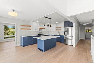 Fabulous West Coast style executive home, offering stunning views and an updated decor. Thoughtfully designed with all your living on the main, including a spectacular great room with additional family room, three bedrooms, including a large primary bedroom and two full bathrooms. The bright airy great room offers vaulted ceilings accented by the warm tones and feature gas fireplaces. The lower level offers an additional bedroom or rec room plus full bath. There is also a one bedroom in-law suite. Loads of decks to enjoy all year long with full southern exposure and beautiful views both night and day. There’s also a great yard for the kids and an oversized double garage. A must see!