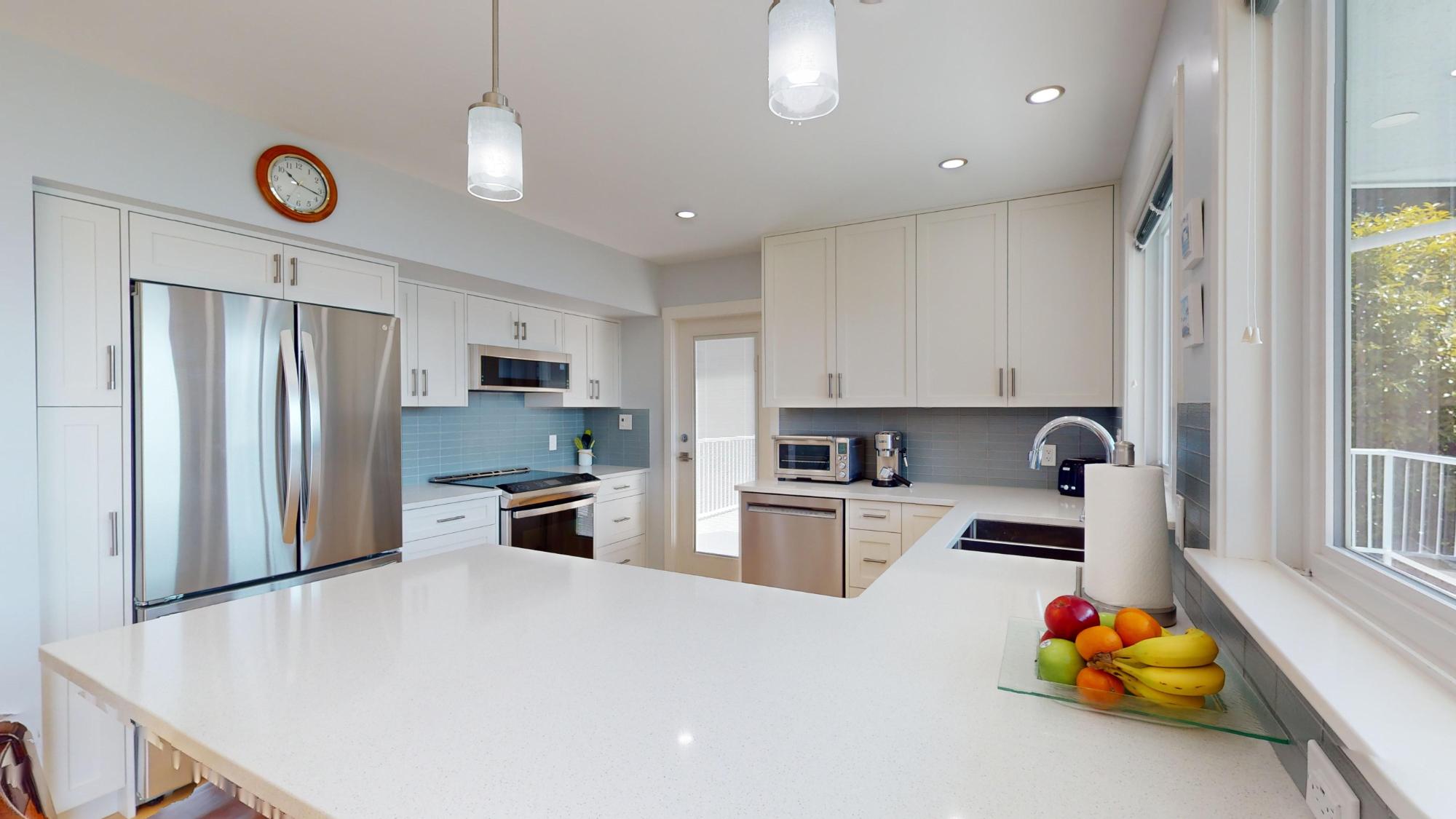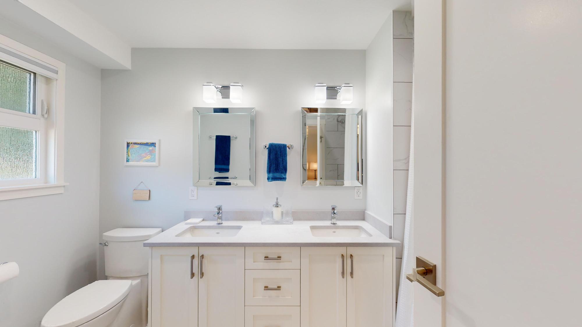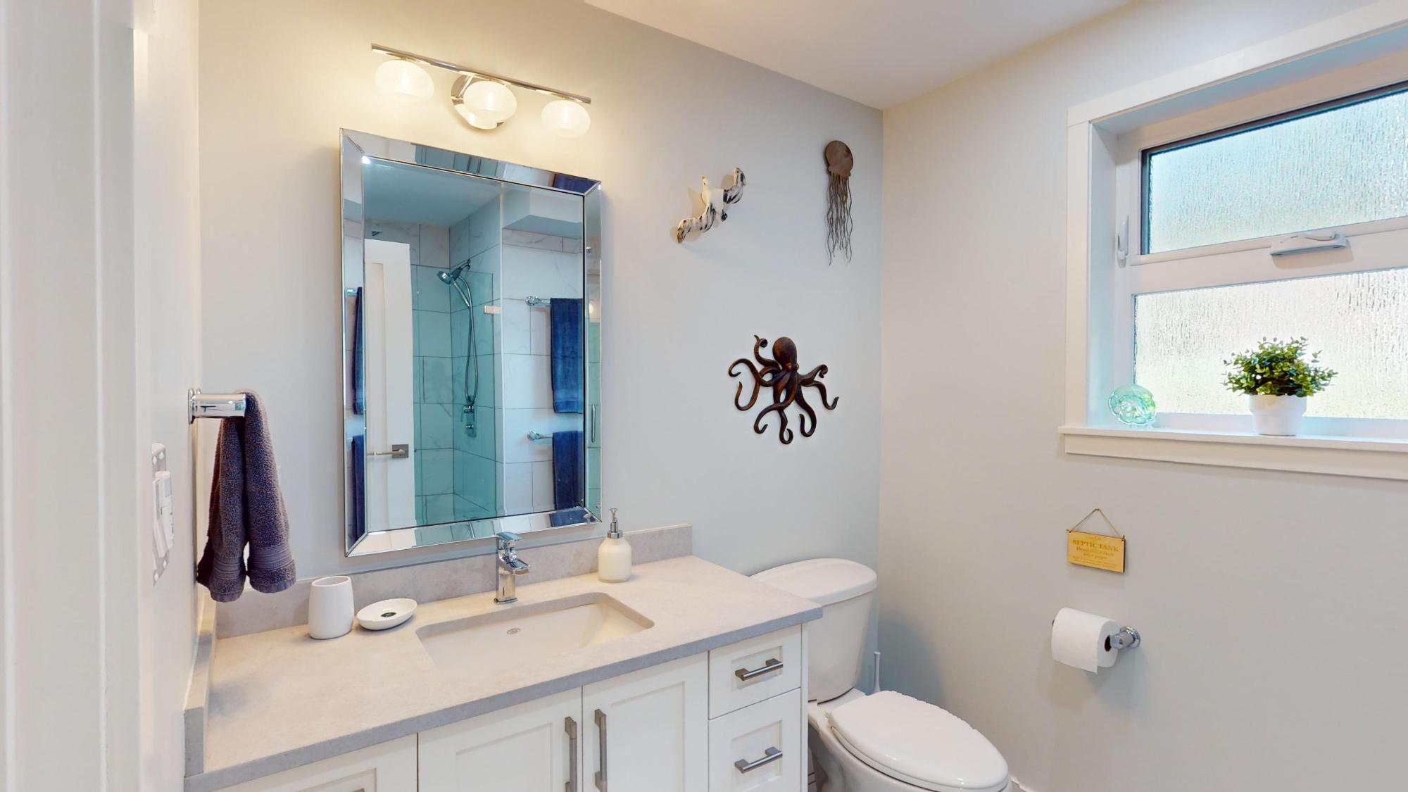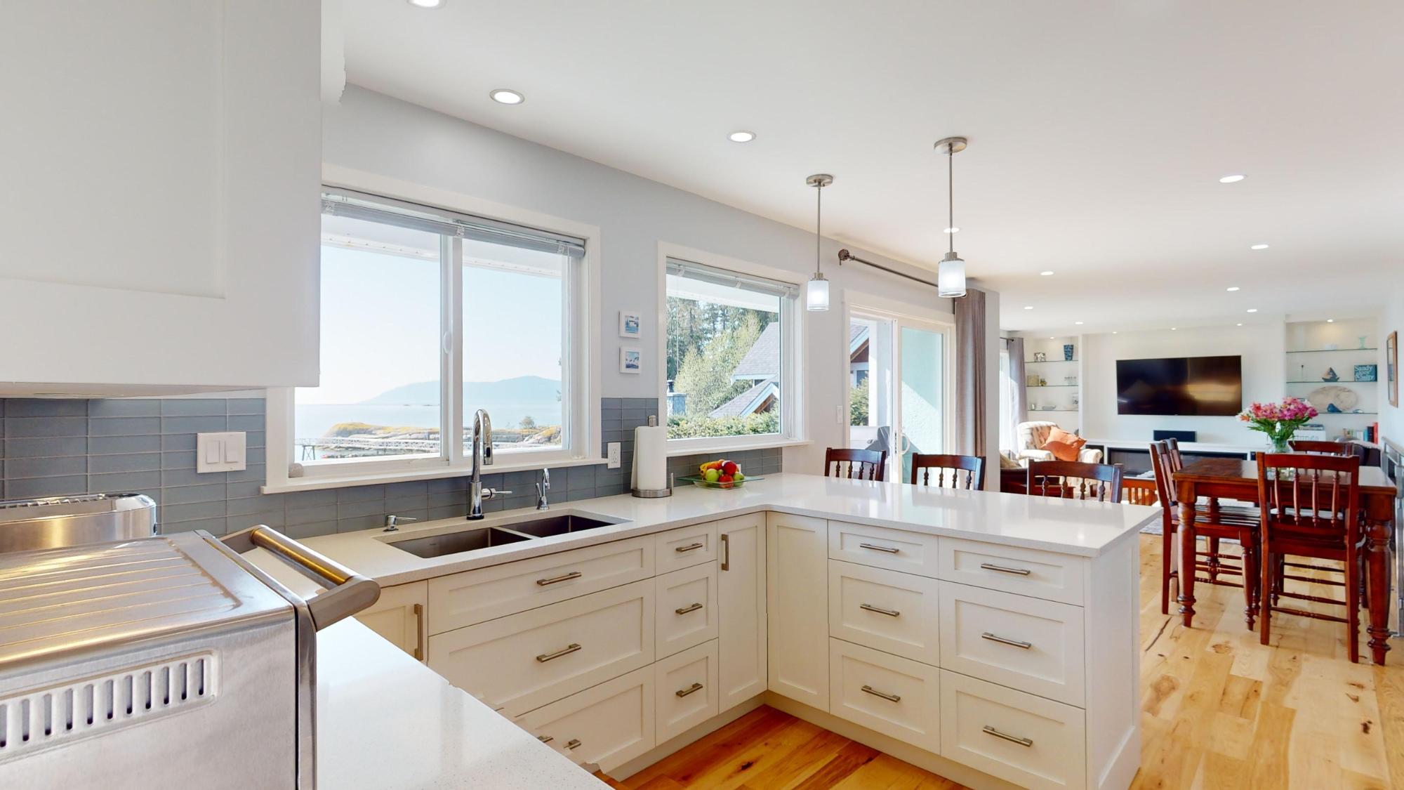 WALK-ON WATERFRONT! This waterfront property offers a combination of exceptional home and awe inspiring seaside living. Nestled in Frolander Bay near the Stillwater Bluffs this home enjoys southern exposure and unobstructed views in a protected bay. The gently sloping lot is over 0.5 an acre with 80' of pristine beachfront. This home has been renovated with stunning hardwood floors, new windows and a bright, open plan ideal for your waterfront retreat. The custom kitchen features ceiling-height cabinets, quartz counters and glass tile backsplash with eat-up peninsula and stainless appliances, opening to the wrap-a-round deck, ideal for hosting. The entire living space is open concept and enjoys natural light and ocean views. Main-level-master features stunning ensuite with rain water shower and dual vanity. The home offers 5 bedrooms and 3 bathrooms. The ground floor has 3 spare bedrooms for guests and family. This stunning home is a must see!