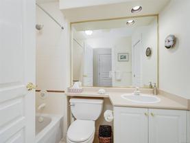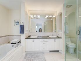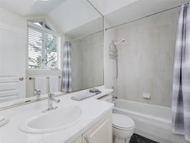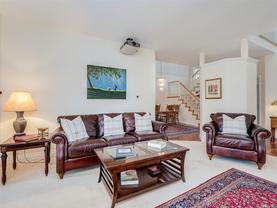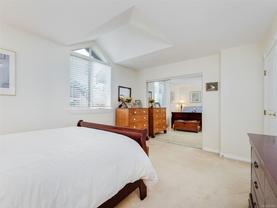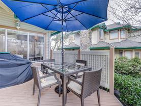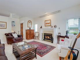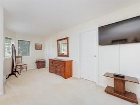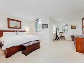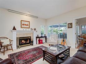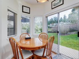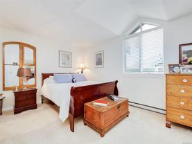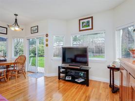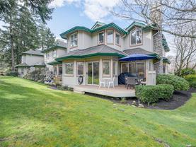 ROYAL LINKS SOUTH EXECUTIVE TOWNHOUSE. Featuring a flexible 3 bed, 3 bath floorplan that includes a primary bedroom on both levels or use lower bedroom as a den. The 9' ceilings allow for natural light in this bright and airy home with beautiful hardwood floors in main living areas. Entertain in the spacious living room with n/g fireplace and projector and screen for entertainment next to the dining area. A well laid out kitchen with marble counters & updated appliances opens to the family rm to enjoy great views of the lush green space & access to a patio. Upstairs presents the main primary bed w/vaulted ceilings, w/i closet, luxury sized updated ensuite, jetted soaker tub & separate shower plus 2nd bedroom with it's own 4 pce ensuite, plus laundry complete this level. Additional features include a double garage, crawl space, n/g furnace & hot water tank. Ideally located just steps from Elk/Beaver Lake park and 10 km trail that circumnavigates the entire lake, recreation, shopping, public transit, easy access to downtown Victoria, airport & ferries.