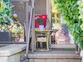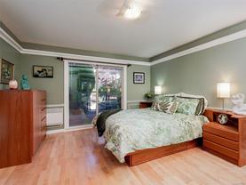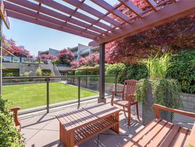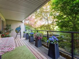 OPEN HOUSE CANCELLED. ACCEPTED OFFER IN PLACE! This beautiful & spacious one-bedroom unit quietly blends into a luscious garden setting that, from its large wooden deck, leads onto a secure private park-like courtyard with paths, benches & a water feature. This is truly a retreat from urban cares! Inside, the open-concept layout includes a cozy fireplace in the living room & stainless steel appliances & granite eating bar in the kitchen. New maple engineered wood floors run throughout, complemented by heated tile floors in the kitchen and bathroom—providing much of the unit’s heat. The bathroom features a deep soaker tub & generous bedroom offers ample closet space. Custom lighting, installed by a former owner/electrician and new Hunter Douglas window coverings throughout add a stylish touch. The well-maintained building at Oak Bay Junction is close to all amenities and offers secure parking, swimming pool, billiards room, sauna, whirlpool, workshop, & recreation room. A sweet suite to call home!